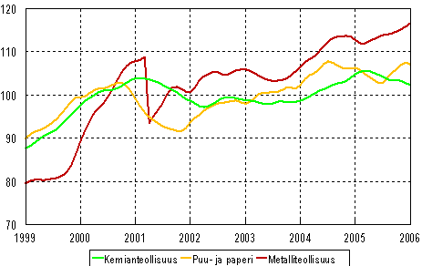 Metalliteollisuuden trendi jatkoi kasvuaan. Metalliteollisuuden osuus Suomen teollisuuden jalostusarvosta oli 45 % vuonna 2004. Puu- ja paperiteollisuuden trendi kääntyi tammikuussa lievään laskuun. Puu- ja paperiteollisuuden osuus jalostusarvosta oli 15 %. Kemianteollisuuden trendi on laskenut viime vuoden puolen välin jälkeen. Kemianteollisuuden osuus jalostusarvosta oli 12 %.