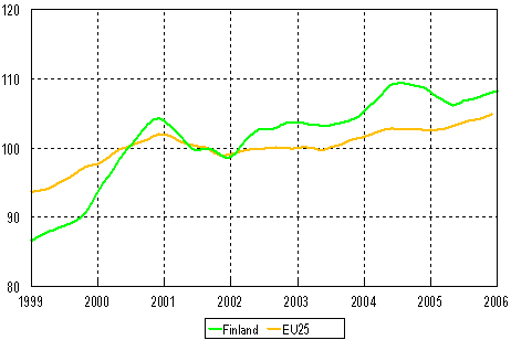 Trenden för industriproduktionen 1999-2006, (Finland och EU 25), 2000=100
