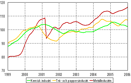 Trenden inom metallindustrin fortsatte uppåt. Metallindustrins andel av förädlingsvärdet inom Finlands industri var 45 procent år 2004. Trenden för trä- och pappersindustrin började svagt gå ner i januari. Trä- och pappersindustrins andel av förädlingsvärdet var 15 procent. Trenden för den kemiska industrin har sjunkit efter medlet av år 2005. Den kemiska industrins andel av förädlingsvärdet var 12 procent.