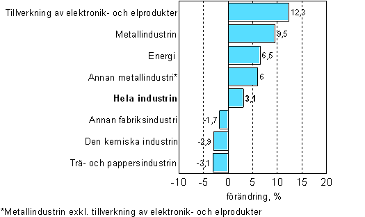Förädlingsvärdets andel av elektronikindustrin var 21 procent år 2004. Produktionen av elektronikindustrin har efter nedgången föregående år åter börja öka. Inom den övriga metallindustrin, vars andel var 24 procent mätt med förädlingsvärdet, har produktionen ökat under början av året.