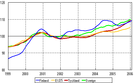 Trenden för industriproduktionen 1999-2006, (Finland, Tyskland, Sverige och EU25), 2000=100