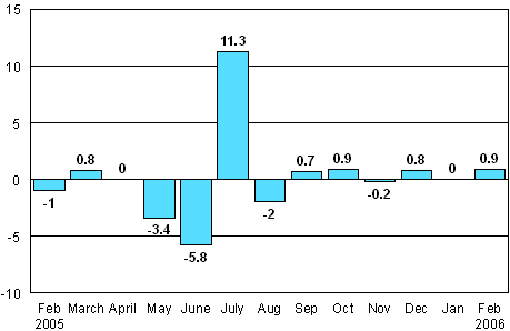 According to Statistics Finland, in February 2006 seasonally adjusted industrial output grew by 0.9 per cent from January 2005. Seasonally adjusted volume of industrial output grew by 3.1 per cent year-on-year from February 2005.