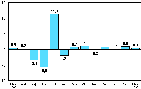 Enligt Statistikcentralen ökade den säsongrensade industriproduktionen med 0,4 procent i mars 2006 jämfört med februari. Jämfört med mars 2005 ökade den säsongrensade industriproduktionsvolymen i mars med 3,1 procent.