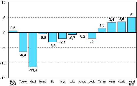 Teollisuuden kausitasoitettu tuotanto oli Tilastokeskuksen mukaan vuoden 2006 huhtikuussa 5 prosenttia suurempi kuin vuoden 2005 huhtikuussa. Teollisuustuotannon kasvu on alkuvuonna ollut vahvaa. Tammi-huhtikuussa kausitasoitettu tuotanto kasvoi 3,4 prosenttia vuoden takaisesta.