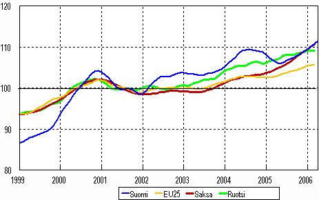 Teollisuustuotannon trendi 1999-2006, (Suomi, Saksa, Ruotsi ja EU 25), 2000=100