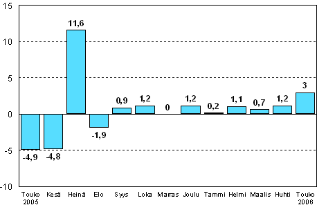 Teollisuuden kausitasoitettu tuotanto kasvoi Tilastokeskuksen mukaan vuoden 2006 toukokuussa 3,0 prosenttia huhtikuusta. Teollisuustuotannon kausitasoitettu tuotantomäärä kasvoi toukokuussa 14,6 prosenttia vuoden 2005 toukokuuhun verrattuna. Edellisen vuoden touko-kesäkuulle osunut paperiteollisuuden työtaistelu näkyy kasvuna vuoden 2006 toukokuun tuotantoluvuissa.