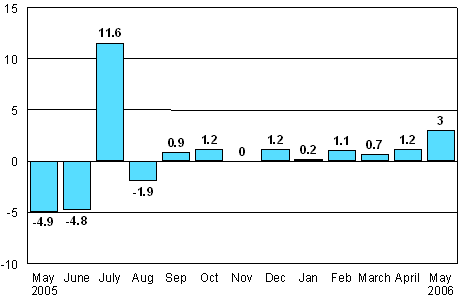 According to Statistics Finland, seasonally adjusted industrial output grew by 3.0 per cent in May 2006 from April. Seasonally adjusted volume of industrial output went up by 14.6 per cent year-on-year from May 2005. The industrial action in the paper industry that coincided with May-June of the previous year can be seen as growth in the figures for industrial output in May 2006.