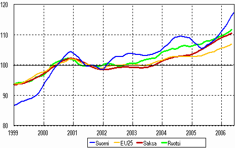 Teollisuustuotannon trendi 1999-2006, (Suomi, Saksa, Ruotsi ja EU 25), 2000=100