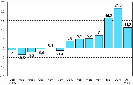 I juli 2006 var den säsongrensade industriproduktionen enligt Statistikcentralen 11,2 procent större än i juli 2005. Under början av året har tillväxten inom industriproduktionen varit kraftig. Den säsongrensade produktionen ökade under januari-juli med 9,8 procent från året innan.