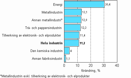 Industriproduktionen ökade i juli inom alla granskade huvudnäringsgrenar. Av huvudnäringsgrenarna ökade energiförsörjningen mest i juli, med drygt 30 procent. Produktionen inom den övriga metallindustrin ökade med närmare 13 procent från året innan. Produktionen inom trä- och pappersindustrin ökade drygt 12 procent. Tillverkningen av elektronik- och elprodukter ökade med drygt 11 procent. Produktionen inom den kemiska industrin ökade med 4 procent.