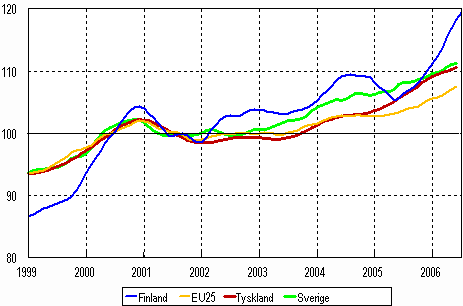 Trenden för industriproduktionen 1999-2006, (Finland, Tyskland, Sverige och EU25), 2000=100