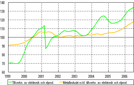 Elektronikindustrins förädlingsvärdeandel var 21 procent år 2004. Produktionen inom elektronikindustrin har efter mitten av år 2005 börjat öka. Produktionen inom den övriga metallindustrin, vars andel var 24 procent mätt med förädlingsvärdet, fortsatte att öka stadigt under början av året.