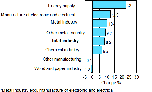 Among the main industries, the biggest growth of good 23 per cent was recorded in August in energy supply. In the metal industry strong growth continues at the rate of good 10 per cent. Manufacture of electrical and electronic products increased by good 12 per cent. In other metal industry output also went up by good 9 per cent. Output in the chemical industry grew by just short of 7 per cent. Output declined most, or by good one per cent, in the pulp and paper industry. Output in other manufacturing remained on level with last year's respective time period.
