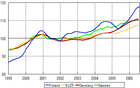 Trend in industrial output 1999-2006, (Finland, Germany, Sweden and EU 25), 2000=100