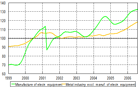 The share of the electronics industry of the total value added was 21 per cent in 2004. Output in the manufacture of electrical and electronic products turned upwards after mid-2005. In other metal industry, which accounted for 24 per cent of the total value added, output continued to go up steadily in early 2006.