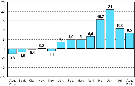 Den säsongrensade förändringen av industriproduktionen 8/2005-8/2006, %