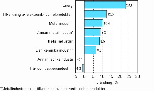 Av de huvudsakliga näringsgrenarna ökade energiförsörjningen mest i augusti, med drygt 23 procent. Metallindustrin växer alltjämt stadigt, dvs. med drygt 10 procent. Tillverkning av elektronik- och elprodukter gick upp med drygt 12 procent. Också produktionen inom den övriga metallindustrin ökade med drygt 9 procent. Produktionen inom den kemiska industrin ökade med något under 7 procent. Produktionen minskade mest inom trä- och pappersindustrin, med drygt en procent. Produktionen inom den övriga fabriksindustrin var på samma nivå som under motsvarande tidpunkt i fjol.