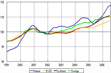 Trenden för industriproduktionen 1999-2006, (Finland, Tyskland, Sverige och EU 25), 2000=100