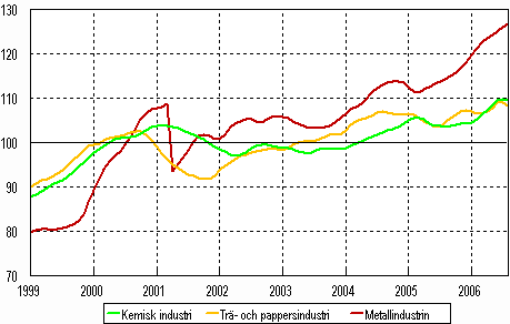 Trenden för industriproduktionen 1999-2006, augusti (Kemisk industri, trä- och pappersindustri och metallindustri), 2000=100