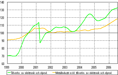Elektronikindustrins andel av förädlingsvärdet var 21 procent år 2004. Produktionen inom elektronikindustrin har efter mitten av år 2005 börjat öka. Produktionen inom den övriga metallindustrin, vars andel var 24 procent mätt med förädlingsvärdet, fortsatte att öka jämnt i början av året.