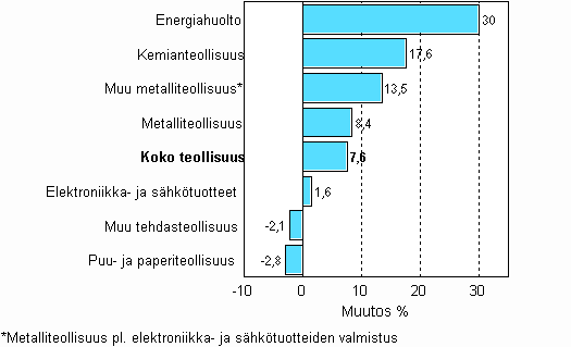 Päätoimialoista syyskuussa kasvoi eniten energiahuolto, 30 prosenttia. Kemianteollisuuden tuotanto kasvoi lähes 18 prosenttia. Metalliteollisuuden tuotanto kasvoi runsaat 8 prosenttia. Elektroniikka- ja sähkötuotteiden valmistus kasvoi vajaat 2 prosenttia. Muu metalliteollisuus kasvoi 13,5 prosenttia. Tuotanto väheni eniten puu- ja paperiteollisuudessa, lähes 3 prosenttia. Muun tehdasteollisuuden tuotanto väheni runsaat 2 prosenttia.