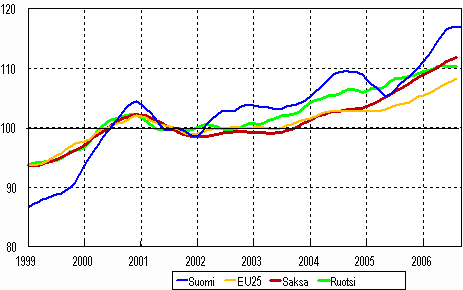Teollisuustuotannon trendi 1999-2006, (Suomi, Saksa, Ruotsi ja EU 25), 2000=100