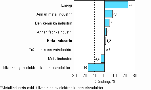 Av de huvudsakliga näringsgrenarna ökade energiförsörjningen mest i oktober, med 23 procent. Övrig metallindustri ökade med nästan 8 procent. Produktionen inom den kemiska industrin ökade med 5 procent. Produktionen minskade mest inom tillverkning av elektronik och elprodukter, med nästan 16 procent. Produktionen inom elektronikindustrin har senast sjunkit lika mycket för fem år sedan. I oktober var produktionen inom metallindustrin något under 4 procent mindre än i oktober i fjol.