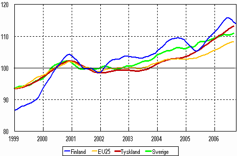 Trenden för industriproduktionen 1999-2006, (Finland, Tyskland, Sverige och EU 25), 2000=100