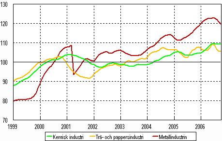 Trenden för industriproduktionen 1999-2006, oktober (Kemisk industri, trä- och pappersindustri och metallindustri), 2000=100