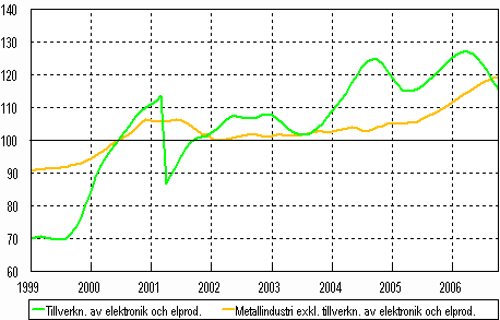 Trenden för industriproduktionen 1999-2006, oktober (Elektronikindustri och övrig metallindustri), 2000=100