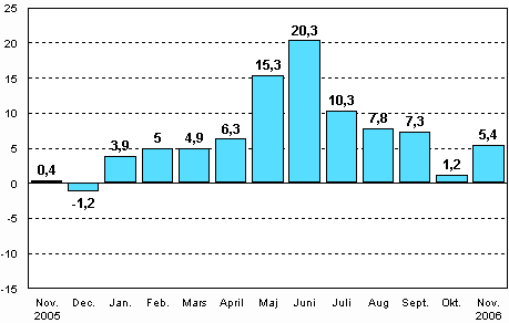 I november 2006 var den säsongrensade industriproduktionen enligt Statistikcentralen 5,4 procent större än i november 2005. Under januari-november ökade den hela säsongrensade industriproduktionen med närmare 8 procent från året innan.