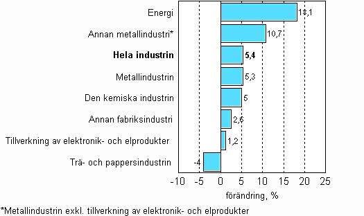 Av de huvudsakliga näringsgrenarna ökade energiförsörjningen mest i november, med 18 procent. Övrig metallindustri ökade med nästan 11 procent. I november var produktionen inom metallindustrin drygt 5 procent större än i november året innan. Produktionen inom den kemiska industrin ökade med 5 procent. Tillverkning av elektronik- och elprodukter gick upp med drygt en procent. Av de huvudsakliga näringsgrenarna minskade produktionen bara inom trä- och pappersindustrin, med 4 procent.