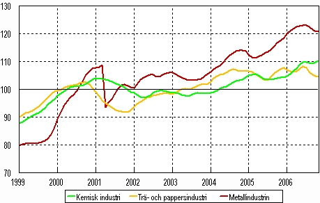 Produktionen inom metallindustrin gick upp i november. Metallindustrins andel av förädlingsvärdet inom Finlands industri var 45 procent år 2004. Den svaga ökningen av produktionen inom den kemiska industrin fortsatte. Den kemiska industrins andel av förädlingsvärdet var 12 procent. Produktionen inom trä- och pappersindustrin gick fortsatt ned i november. Trä- och pappersindustrins andel av förädlingsvärdet var 15 procent.