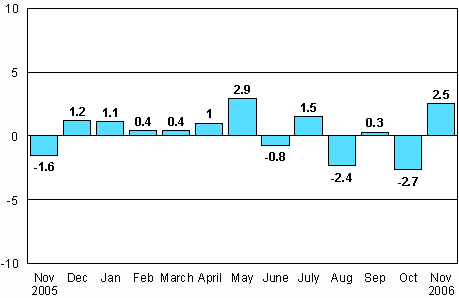According to Statistics Finland, seasonally adjusted industrial output was 2.5 per cent higher in November 2006 than in October. Seasonally adjusted volume of industrial output went up by 5.4 per cent year-on-year from November 2005.