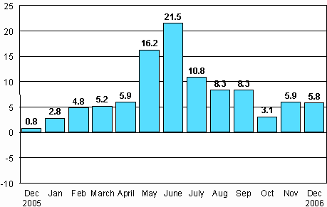 According to Statistics Finland, seasonally adjusted industrial output was 5.8 per cent higher in December 2006 than in December 2005.