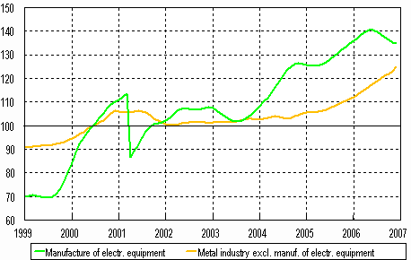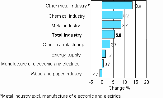 With the exception of the wood and paper industry, output went up in all main industries. The largest growth of nearly 14 per cent was recorded in December in other metal industry. Strong growth also continued in December in the chemical industry, where output went up by good 9 per cent. The prolonged strong growth in energy supply moderated to an increase of just short of 2 per cent. Manufacture of electrical and electronic products only grew by barely one per cent.