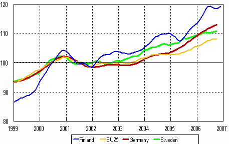 Trend in industrial output 1999-2006, (Finland, EU 25, Germany and Sweden), 2000=100