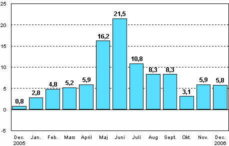 I december 2006 var den säsongrensade industriproduktionen enligt Statistikcentralen 5,8 procent större än i december 2005.