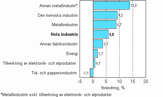 Produktionen ökade inom alla huvudnäringsgrenar, med undantag av trä- och pappersindustrin. I december ökade övrig metallindustri mest, med närmare 14 procent. Också den starka tillväxten inom den kemiska industrin fortsatte i december. Produktion ökade med drygt 9 procent. Den kraftiga uppgång som pågått länge inom energiförsörjningen planade ut till en ökning på något under 2 procent. Tillverkning av elektronik- och elprodukter ökade bara med något under 1 procent.