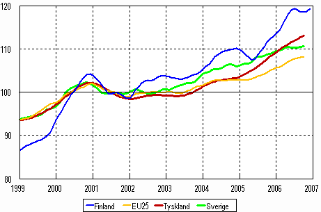 Trenden för industriproduktionen 1999-2006, (Finland, EU 25, Tyskland och Sverige), 2000=100