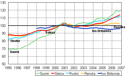 Teollisuustuotannon trendi TOL C,D,E, Suomi, Saksa, Ruotsi, Ranska ja Iso-Britannia 1995 - 2006, 2000=100