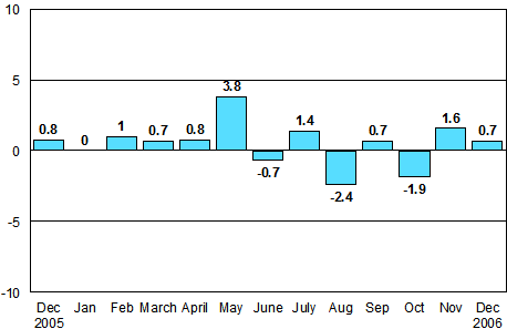 According to Statistics Finland, seasonally adjusted industrial output was 0.7 per cent higher in December 2006 than in November. Seasonally adjusted volume of industrial output increased by 5.8 per cent year-on-year from December 2005. According to preliminary data calculated by Statistics Finland industrial output grew by 7.8 per cent in 2006.