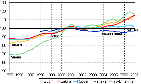 Teollisuustuotannon trendi TOL C,D,E, Suomi, Saksa, Ruotsi, Ranska ja Iso-Britannia 1995 - 2007, 2000=100