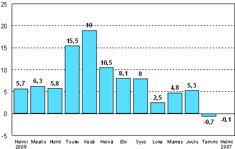 Teollisuuden kausitasoitettu tuotanto oli Tilastokeskuksen mukaan vuoden 2007 helmikuussa 0,1 prosenttia pienempi kuin vuoden 2006 helmikuussa. Teollisuustuotannon koko viime vuoden jatkunut kasvu pysähtyi tammikuussa.