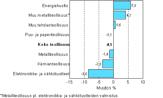 Tuotanto laski helmikuussa useilla päätoimialoilla. Eniten laski elektroniikka- ja sähkötuotteiden valmistus, runsaat 8 prosenttia. Kemianteollisuuden tuotanto väheni vajaat 4 prosenttia. Metalliteollisuuden tuotanto väheni runsaan prosentin. Energiahuollon kasvu sen sijaan jatkui myös helmikuussa. Energiahuolto kasvoi lähes 6 prosenttia.