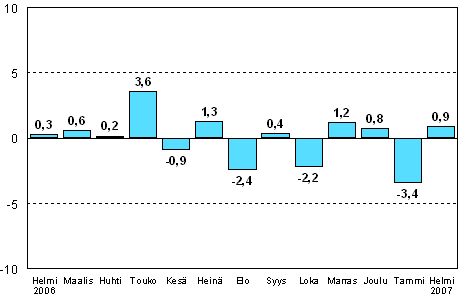 Teollisuuden kausitasoitettu tuotanto oli Tilastokeskuksen mukaan vuoden 2007 helmikuussa 0,9 prosenttia suurempi kuin tammikuussa.