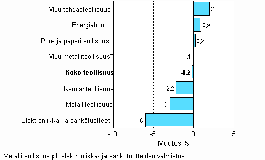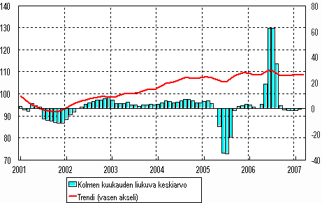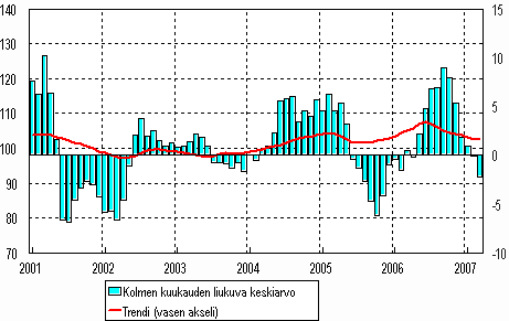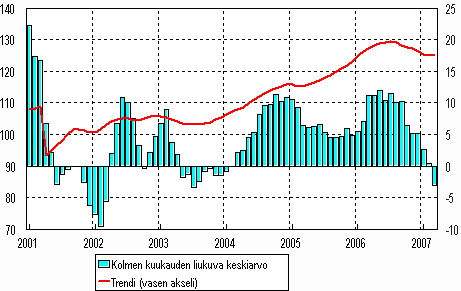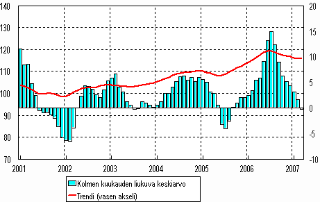 Vuoden 2007 ensimmäisellä neljänneksellä teollisuustuotanto oli Tilastokeskuksen ennakkotietojen perusteella 0,2 prosenttia pienempi kuin vuoden 2006 vastaavana ajankohtana. Teollisuustuotannon volyymi-indeksi perustuu runsaan 1000 toimipaikan otokseen Suomessa toimivista toimipaikoista. Otokseen valitaan toimialojensa suurimpia toimipaikkoja. Teollisuustuotannon kasvun hidastuminen johtuu osaksi siitä, että teollisia toimipaikkoja on siirtänyt tai siirtämässä tuotantotoimintaansa ulos Suomesta. Katsauksessa olevat kolmen kuukauden liukuvat keskiarvoluvut perustuvat kausitasoitettuihin indeksipistelukuihin.