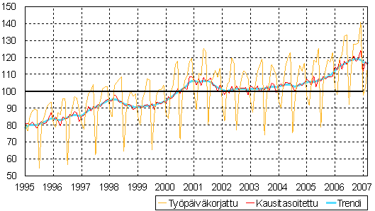 teollisuustuotannon volyymi-indeksi 1995 - 2007 maaliskuu,