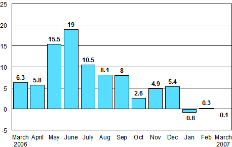 According to Statistics Finland, seasonally adjusted industrial output was 0.1 per cent lower in March 2007 than twelve months earlier. The growth in industrial output, which continued all of last year, stalled in the beginning of the year.
