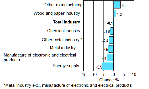Output fell in several main industries in March. Energy supply decreased the most, by 5.5 per cent. Manufacture of electrical and electronic products fell by a good 3 per cent in March. In the chemical industry output declined by just short of 2 per cent and in the metal industry by 2.5 per cent. In March, growth industries included other manufacturing, which grew by 3.5 per cent, and wood and paper industry, where output was a good one per cent higher than one year previously.
